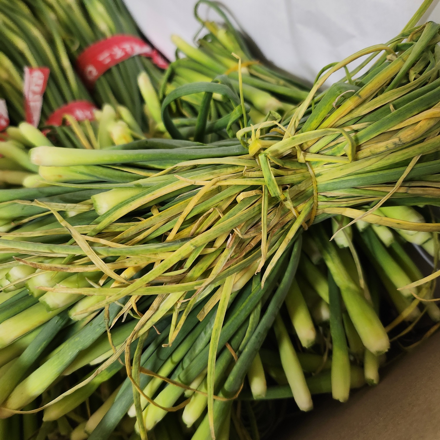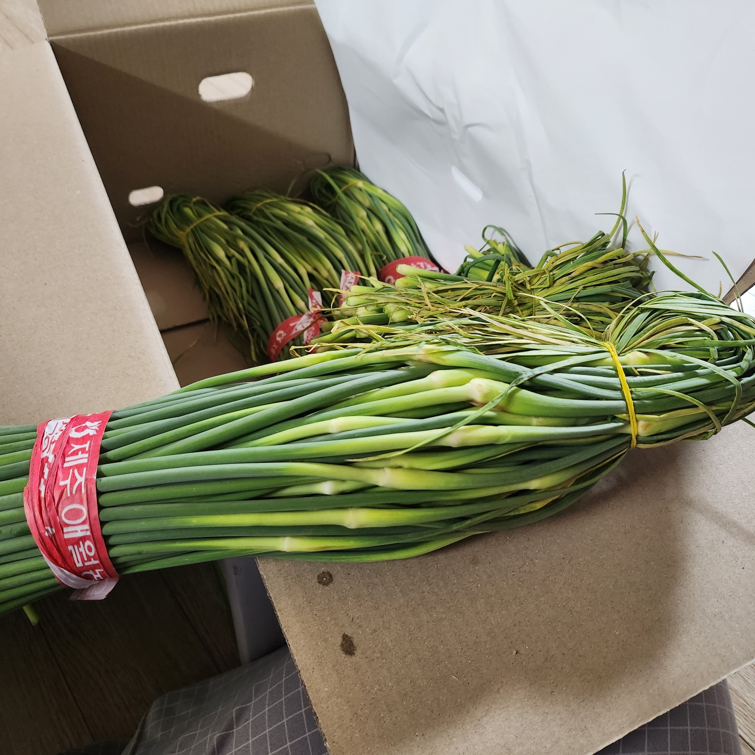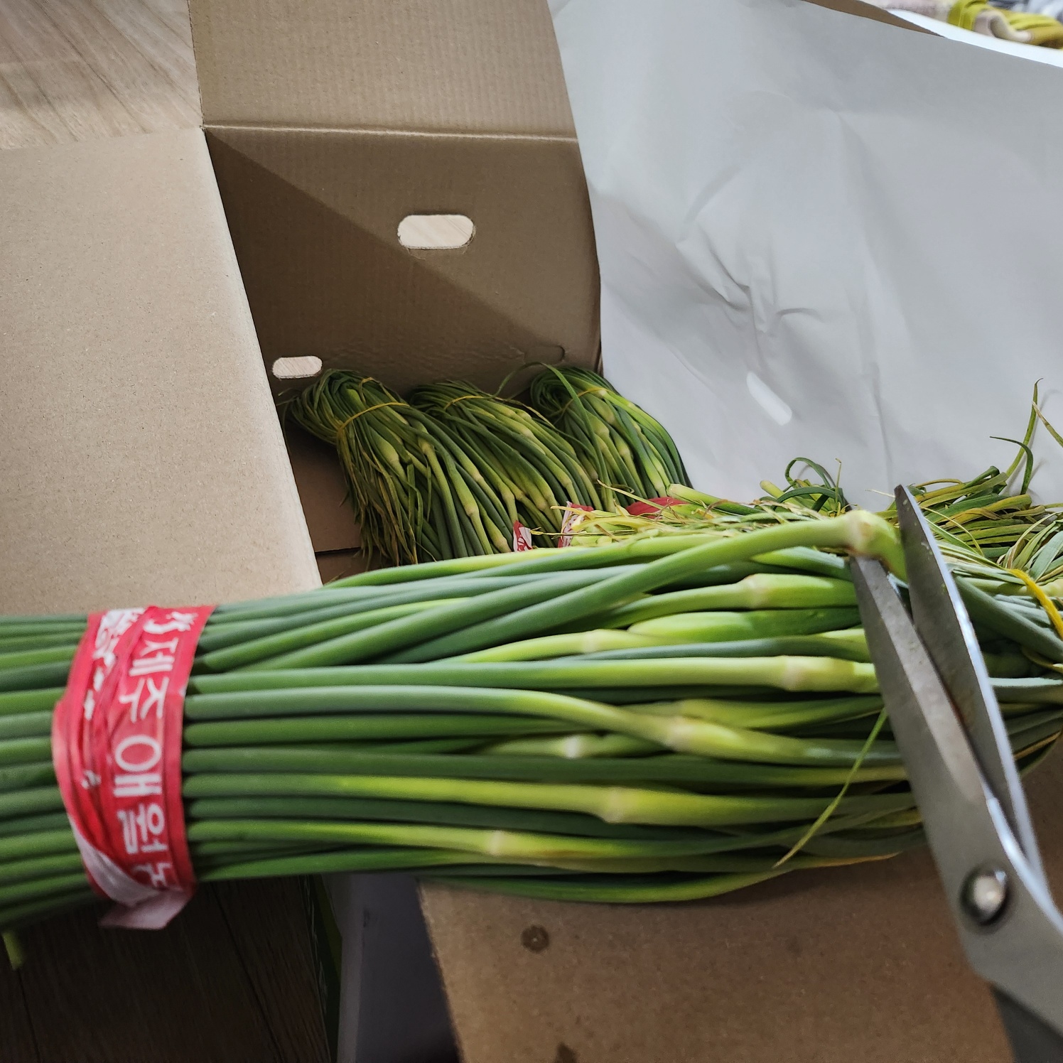 한 단씩 고무줄로 묶여서 오는데 풀지말고 가위로 먼저 보이는 마디부터 잘라주면 지저분해지지 않아서 편하다.