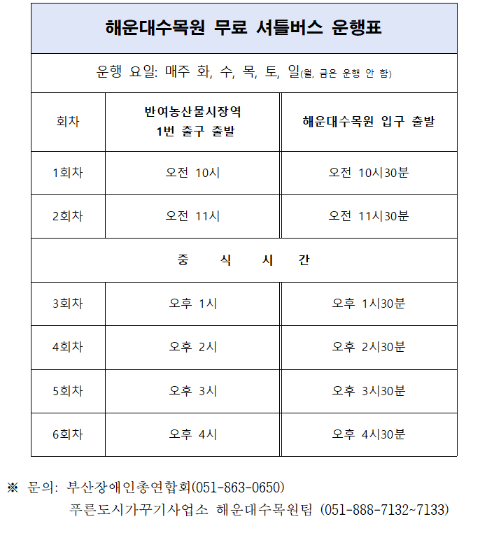 해운대수목원을 찾는 시민들의 불편함을 해소하기 위해 부산장애인 총연합회가 나섰습니다. 대중교통을 이용해 수목원까지 약 1.5km를 걸어야 했던 불편함을 해결하기 위해, 장애인과 비장애인 모두가 무료로 이용할 수 있는 45인승 대형 셔틀버스(휠체어 6석, 일반 25석)를 제공하게 되었습니다.